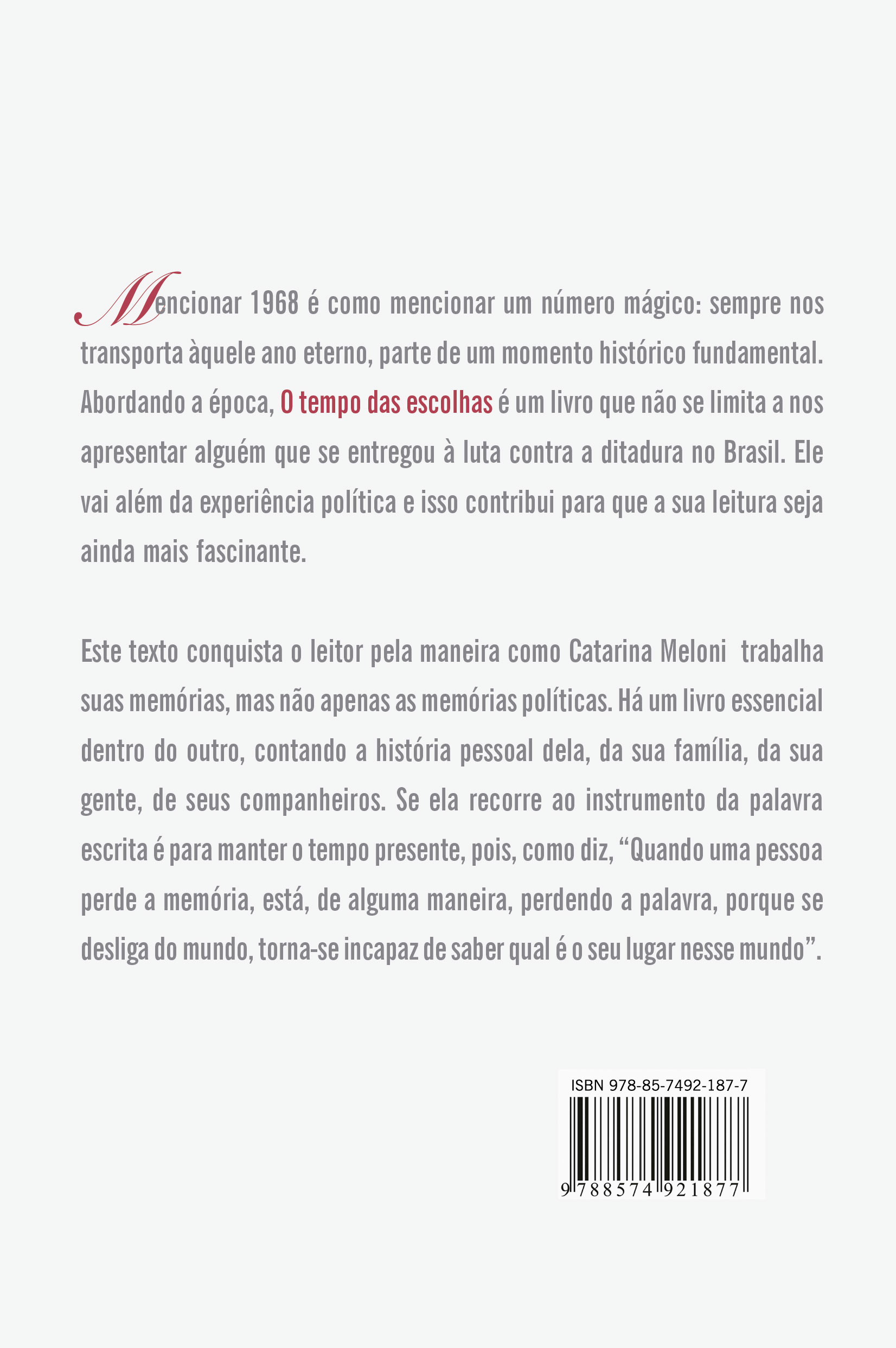 Mencionar 1968 é como mencionar um número mágico: sempre nos transporta àquele ano eterno, parte de um momento histórico fundamental. Abordando a época. O tempo das escolhas é um livro que não se limita a nos apresentar alguém que se entregou à luta contra a ditadura no Brasil. Ele vai além da experiência política e isso contribui para que a sua leitura seja ainda mais fascinante.