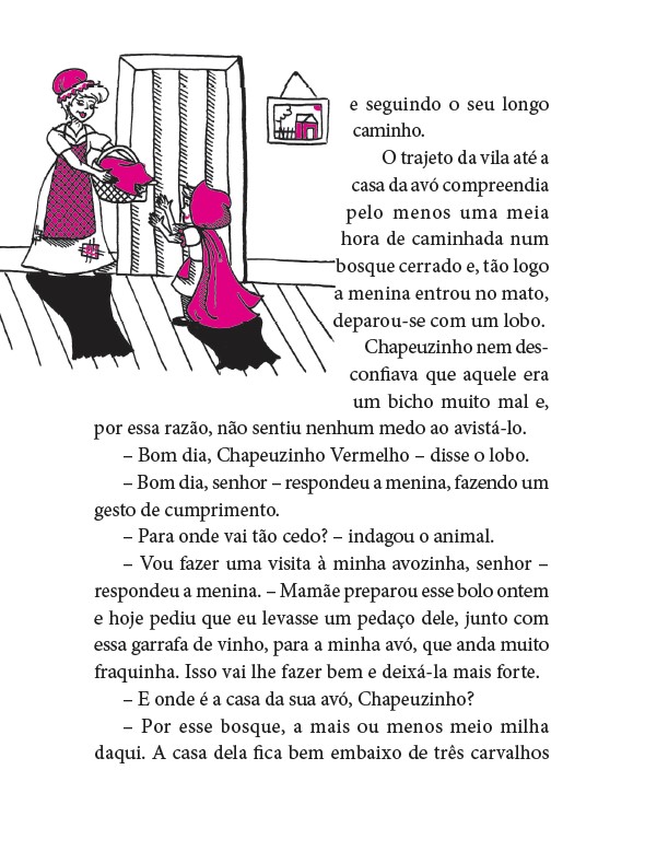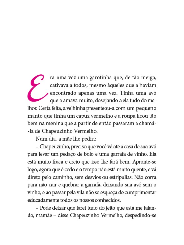 Chapeuzinho Vermelho é a personagem mais conhecida de toda a literatura infantil mundial. Ela é tão famosa que cada um conta sua história de um jeito diferente, às vezes um pouco, às vezes muito… muito diferente. Numas histórias, ela é bem pequenininha e indefesa, noutras, ela é pequeninha e espertíssima. Há histórias em que ela já é pré-adolescente. Noutras já é uma jovem decidida. Ela está em desenhos animados, histórias em quadrinhos, filmes – alguns verdadeiros clássicos do cinema. Qual será a versão original dos irmãos Grimm? Para saber, tem que ler, né?