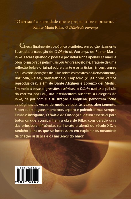 Chega finalmente ao público brasileiro, em edição ricamente ilustrada, a tradução de O Diário de Florença, de Rainer Maria Rilke. Escrita quando o poeta e prosador tinha apenas 22 anos, a obra foi inspirada pela musa Lou Andreas-Salomé. Trata-se de uma reflexão bela e original sobre a arte e os artistas. Encontram-se aqui as considerações de Rilke sobre os mestres do Renascimento, Botticelli, Rafael, Michelangelo, Carpaccio (cujas obras vemos reproduzidas), além de Dante Alighieri e Lorenzo dei Medici. Em meio a essas digressões estéticas, o Diário traduz a paixão do escritor por Lou, sua interlocutora ausente. As alegrias de Rilke, de par com sua frustração e angústia, percorrem todas as páginas, às vezes de modo velado, às vezes abertamente. Sincero, em alguns momentos áspero e polêmico, mas sempre lúcido e instigante, O Diário de Florença é leitura essencial para todos os que acompanham a obra de Rilke, considerado uma das principais influências na literatura alemã do século XX, e também para os que se interessam em explorar os meandros da criação artística e os mistérios do amor.