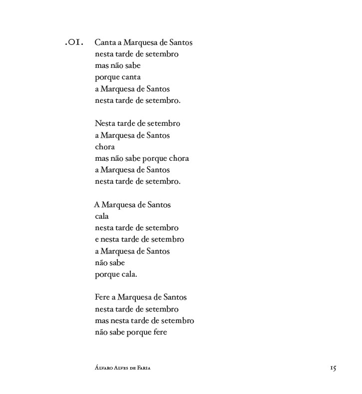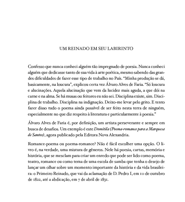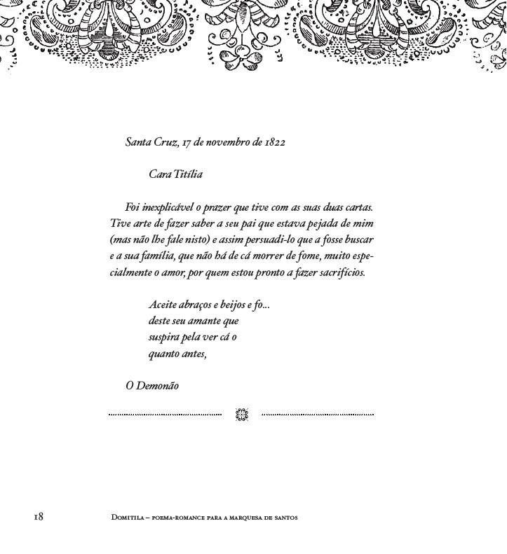 A história oficial reserva poucas páginas para a Marquesa de Santos. Sua história de amor com D. Pedro I foi, no entanto, documentada em cartas, escritas entre 1823 e 1827. As cartas dirigidas a ela foram preservadas para a posteridade, ao contrário da correspondência desta ao Imperador, destruída pelo zelo hipócrita deste ou de seus súditos. Esta lacuna é preenchida pela sensibilidade do poeta Álvaro Alves de Faria, que assume o eu lírico de Domitila, neste poema-romance em que se equilibram ousadia e beleza.