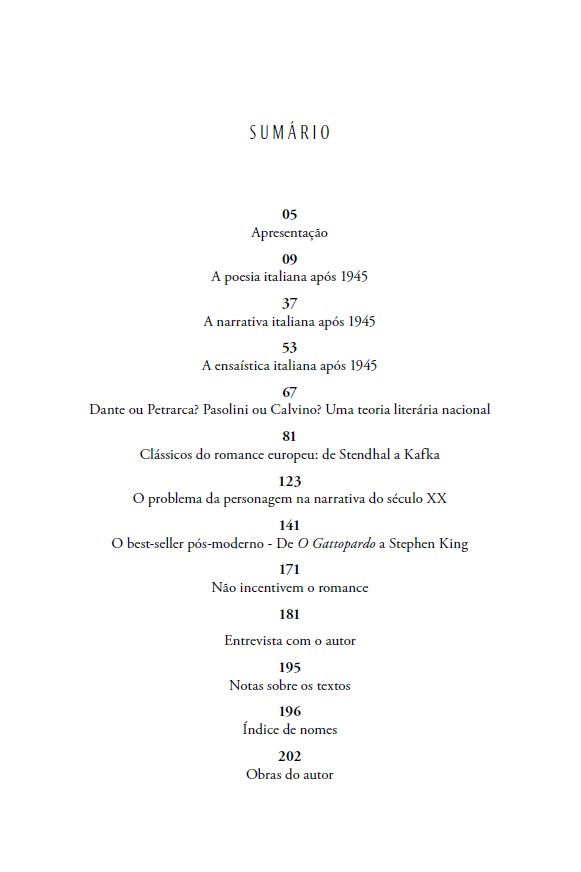 O tema mais debatido neste volume é a narrativa, com ensaios sobre a tradição e a crise do romance europeu de Stendhal a Kafka, a narrativa italiana após 1945, o best-seller, a situação do romance contemporâneo. Mas temos também um quadro, por um extraordinário leitor de poesia, de quarenta anos (1945-1995) de poesia italiana. De si mesmo e de sua vocação crítica o autor fala na aula sobre o ensaio: um texto que leva a compreender melhor a sua própria colocação na tradição da crítica militante, entre o livro e a vida.